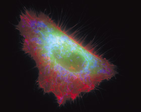 The large Stokes shift property of Keima-Red allows effective applications such as for single wavelength excitation simultaneous multi-color imaging and single laser line FCCS.