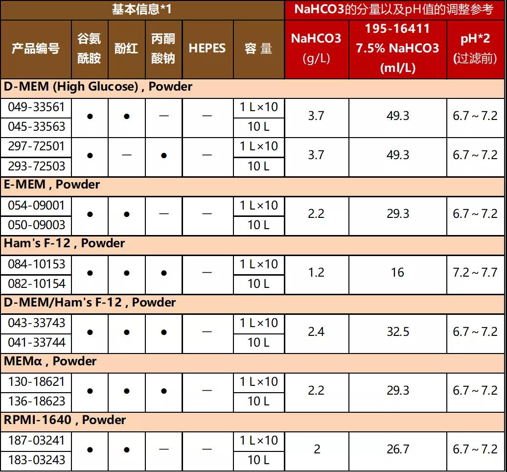 4. 必要时,使用1N NaOH或1N HCl调整pH值。NaHCO3 的分量以及pH值的调整请参考以下表格。