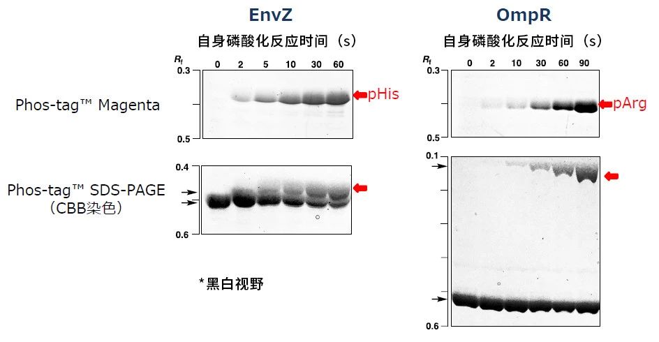 可以确认Phos-tag™ Magenta和Phos-tag™ SDS-PAGE 这两种试剂中的His和Asp的磷酸化随激酶的处理时间经过不断增强。尤其是使用Phos-tag™ Magenta时,可以仅检测出His磷酸化或Asp磷酸化。