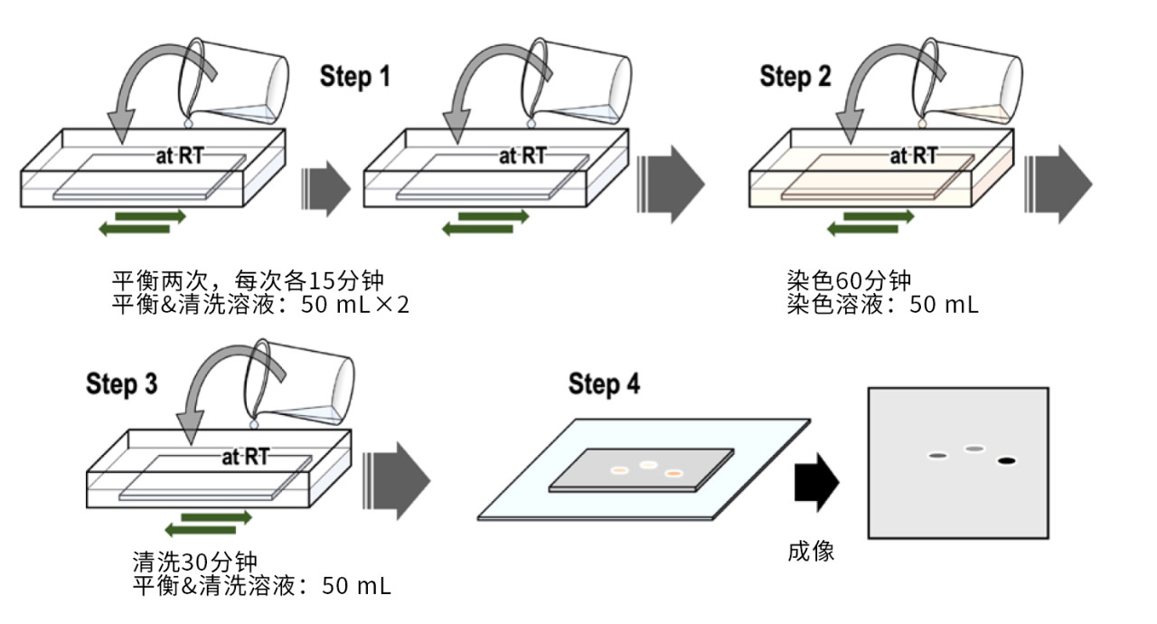 ※调整平衡及清洗溶液以及染色溶液必须使用Mixed reagents for Phos-tag™ Common Solution 5× (产品编号:383-15231)。