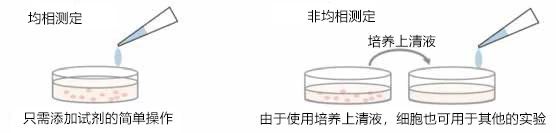 ● 细胞存在下(均相测定),仅用细胞培养(非均相测定)均能进行测定。