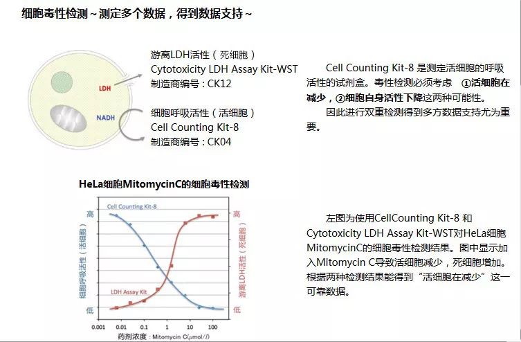 当进行以活细胞的呼吸活性(ATP或NADPH)为指标的细胞毒性试验时,必须考虑两种可能性,(1)活细胞数量是否有减少,(2)细胞自体的呼吸活性是否有下降。此时,不仅通过活细胞的呼吸活性还可以通过LDH Assay进行细胞毒性试验,得到毒性试验数据的支持。