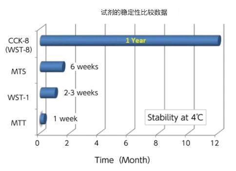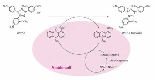 Cell Counting Kit-8采用新型四唑盐「WST-8」。由于四唑盐和甲臜都是高度水溶性的,因此不需要像MTT测定那样的溶解操作。