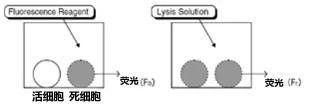 本产品是使用Fluorometric Assay based on Cell Lysis & Staining method (FACLS 法)对死细胞、全细胞数及细胞存活率进行测定的试剂盒。组合使用核酸荧光染色剂和细胞溶解剂进行测定。核酸荧光染色剂可以穿透死细胞的细胞膜而与核酸发生反应发出荧光,而对活细胞的细胞膜则没有膜透过性。