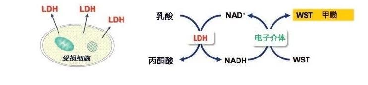 在LDH的作用下乳酸会被丙酮酸氧化,而辅酶会被NADH还原。样品中根据LDH活性按比例生成的NADH会在心肌黄酶的作用下会将硝基蓝四氮唑还原,生成蓝紫色的双蚁酯。在560 nm(±10 nm)下测定这个显色液的吸光度。