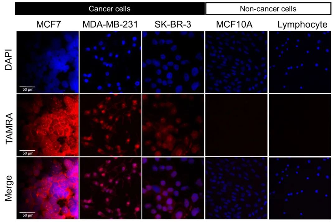 使用30 μM的PolyamineRED处理3种癌细胞(MCF7,MDA-MB-231,SK-BR-3)与2种非癌细胞(MCF10A,淋巴球)10 min,使用PBS清洗三遍,在DAPI染色后用福尔马林固定细胞。在癌细胞中观察到了TAMRA信号。另一方面,由于非癌细胞中的多胺数量较少,因此在MCF10与淋巴球中几乎检测不出TAMRA信号。