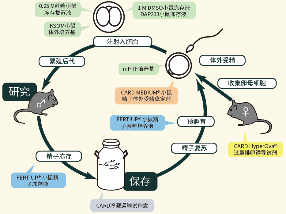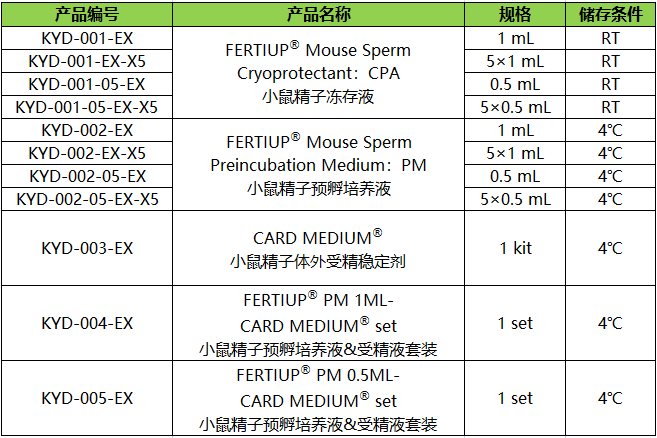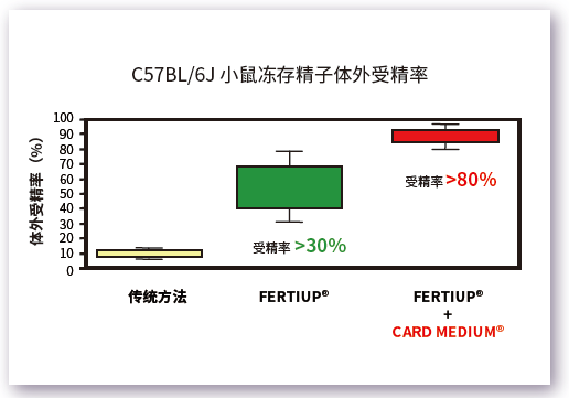 FERTIUP® 和CARD MEDIUM® 是用于小鼠精子冻存、预孵培养和体外受精(IVF)的高性能试剂,两个系列组合使用可提高冻存小鼠精子的复苏率并且提高体外受精成功率。