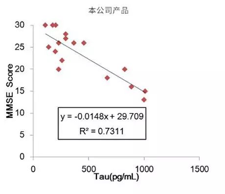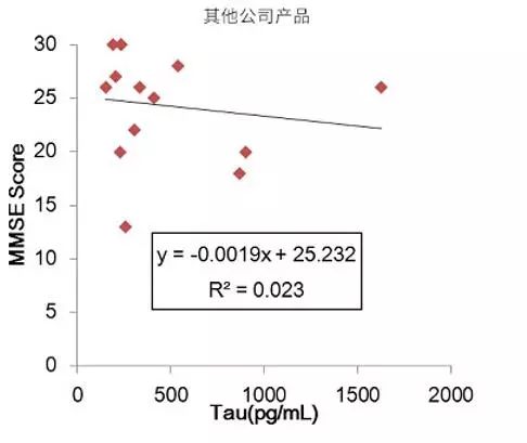 结果表明:对比其他公司产品,使用本试剂盒测得的Tau浓度与MMSE Score具有更高的相关性。