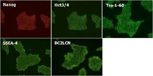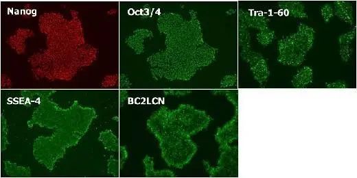 使用StemSure® hPSC培养基进行5次传代维持培养,确认到全部未分化标志物(Nanog, Oct3/4, Tra-1-60, SSEA-4, BC2LCN)的表达。
