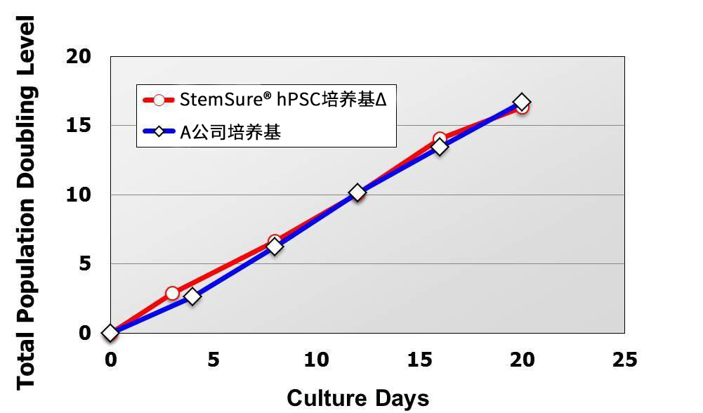 移植到StemSure® hPSC培养基Δ后,立即进行第1~5次传代。结果显示,与A公司培养基相比,细胞的增殖能力没有差异。