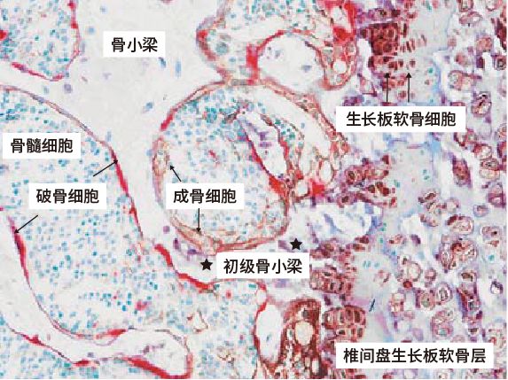 ● 用ALP染色剂使成骨细胞的细胞膜、软骨细胞和细胞间膜呈茶褐色。