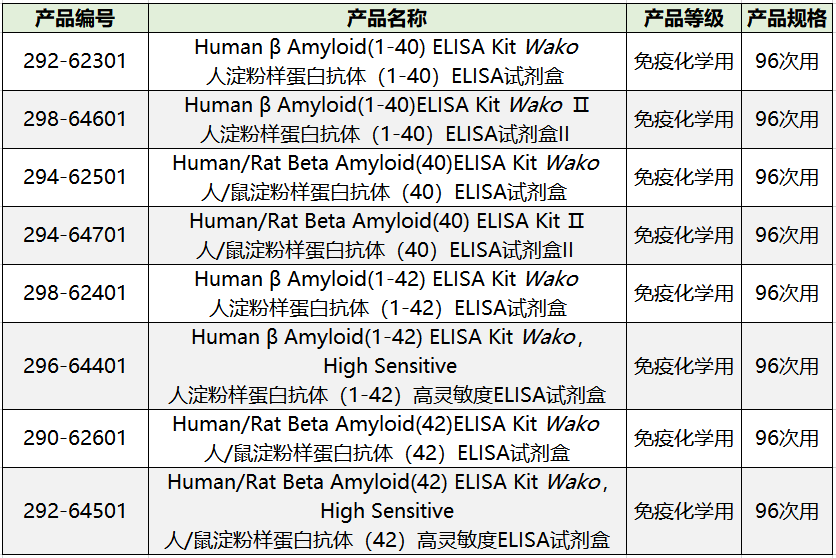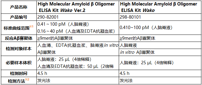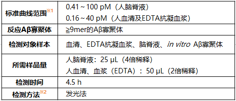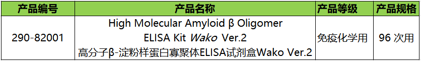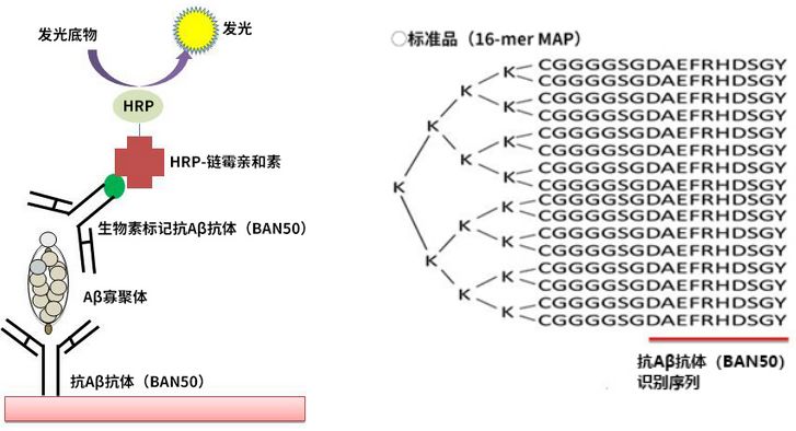 本系列采取双抗体夹心法ELISA,使用抗Aβ抗体(BAN50)作为捕获抗体和检测抗体,与1~8-mer几乎不发生反应,与9-mer以上的Aβ寡聚体则发生特异性反应。使用带有16个抗Aβ抗体(BAN50的抗体识别序列的16-mer MAP肽作为标准品。