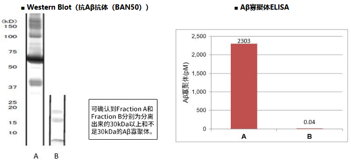 将Aβ1-42肽冷藏并孵育过夜后,通过超滤分离为不足30 kDa(8聚体以下)和30 kDa以上(9聚体以上),并使用Aβ抗体(BAN50)对各组进行Western Blot和ELISA(本方法)检测。