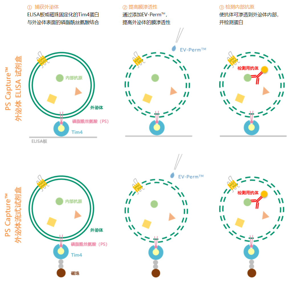 ※ 请配合PS Capture™ 外泌体 ELISA 试剂盒和 PS Capture™ 外泌体流式细胞术试剂盒使用本试剂。另外,检测抗体需单独制备。