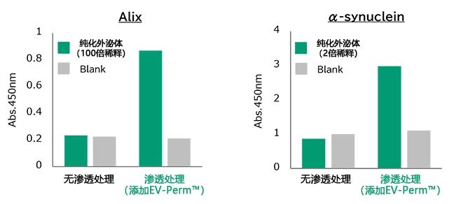 使用EV-Perm™对外泌体样品进行渗透预处理,对从HEK293T细胞培养上清中纯化的外泌体内部的Alix,以及从H4细胞培养上清中纯化的外泌体内部的α-synuclein使用PS Capture™ 外泌体 ELISA 试剂盒(链霉亲和素HRP)进行检测。