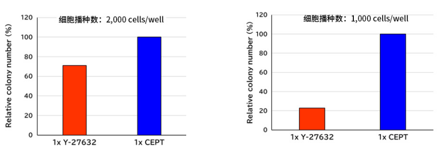 细胞接种数少时,添加CEPT的组比添加Y-27632的组形成的细胞集落更多。