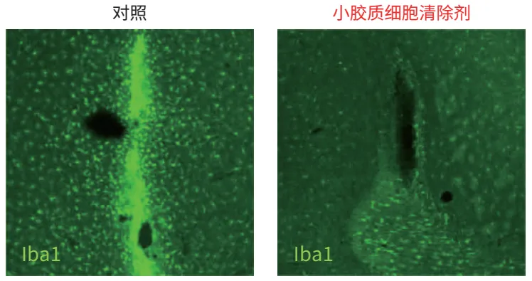 对照组中,大量的小胶质细胞(或巨噬细胞)聚集在受损部位。小胶质细胞清除剂给药组中,受损部位小胶质细胞的聚集受到抑制,且受损部位周围的小胶质细胞也有所减少或消退。