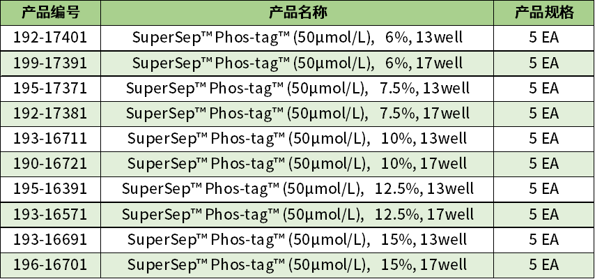 SuperSep™ Phos-tag™ 系列是专为磷酸化蛋白的分离而设计的预制胶,由Phos-tag™ 丙烯酰胺制备而成,利用螯合有金属离子的Phos-tag™ 可以特异性结合磷酸化基团的特点 ,区分不同磷酸化水平的蛋白质。即开即用,无需繁琐配制。