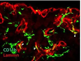 在中枢神经系中,层粘连蛋白几乎只在血管周边的基底膜中表达,被用作血管的标志物。既往的研究显示,脑血管基底膜内层(内皮侧)含有层粘连蛋白-411和-511,而外层(脑实质侧)含有层粘连蛋白-211和-1111),参与血脑屏障(BBB: Blood-Brain Barrier)的形成与功能。