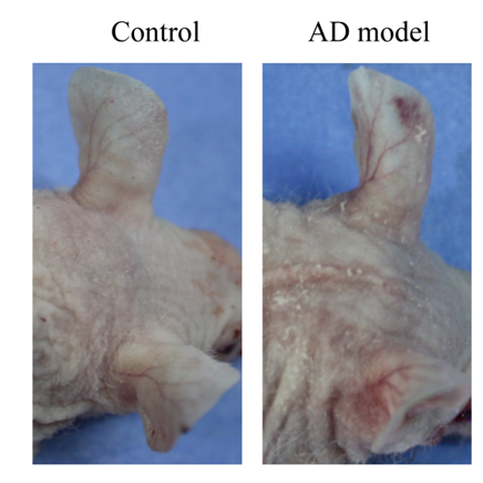 1、用4%十二烷基硫酸钠(SDS)破坏屏障后,每周两次在剃毛的背部皮肤和两耳廓部涂抹100 mg的AD。